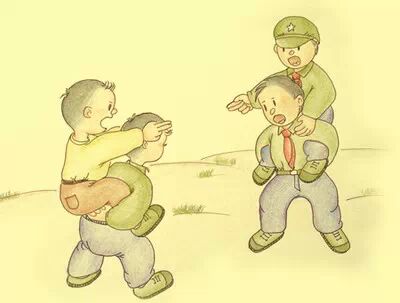 男孩子们通常都以2人一组分成多个组,一个人骑在另一个人背上,把对方弄下来为胜,男孩子们通常玩得不亦乐乎,当然,这也经常成为打架的来由。